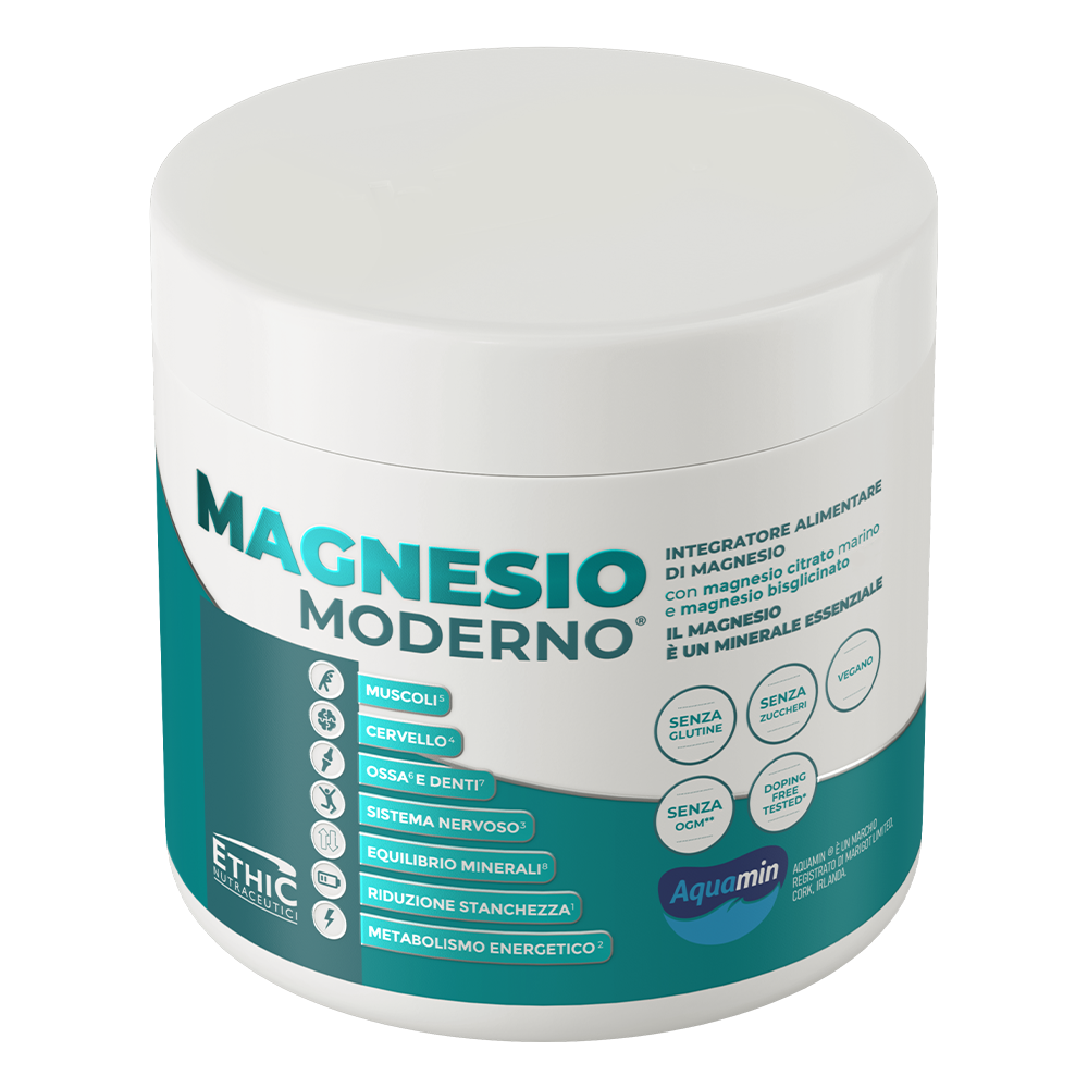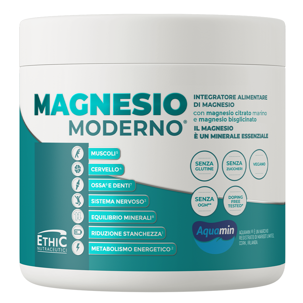 Suplement diety Ethic Nutraceutici Magnesio Moderno® to preparat o oryginalnej i innowacyjnej formule, który zawiera morski cytrynian magnezu (Aquamin) w połączeniu z chelatowanym magnezem. Obecność aminokwasu sprawia, że magnez jest szczególnie biodostępny dla organizmu i wspomaga jego wchłanianie. Pierwiastek ten jest szeroko rozpowszechniony w żywności, a w ludzkim ustroju jest magazynowany głównie w mięśniach oraz kościach. Ethic Nutraceutici Magnesio Moderno® dostarcza do organizmu magnez w najczystszej i najlepiej przyswajalnej postaci, co pozytywnie oddziałuje na jakość produktu i efektywność suplementacji.